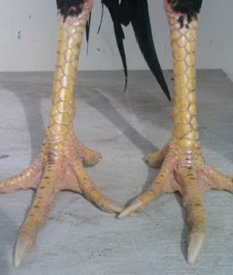 Adapun ciri sisik kaki ayam yang mempunyai kekuatan pukul keras harus kering dengan sisik kaki bagian belakang dari kaki terlihat berderet mengarah keatas ada juga yang kebawah yang dalam katuranggan ayam disebut sisik naga mangsa dan.